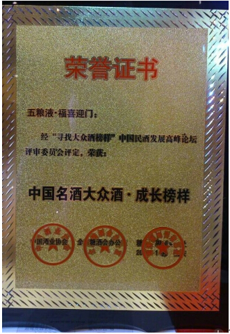 五粮液福喜迎门酒喜获“中国名酒大众酒?成长榜样”荣誉称号