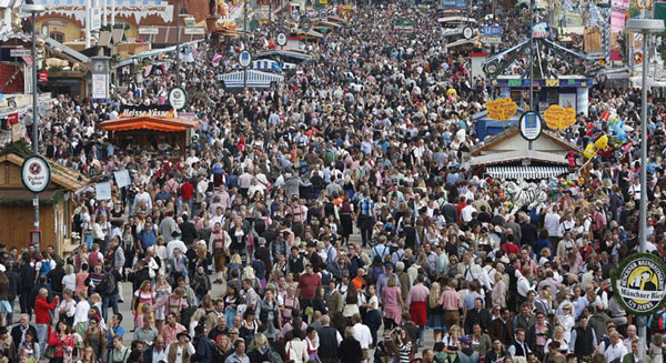 起初,拥有数百年悠久历史的慕尼黑啤酒节是为了庆祝巴伐利亚州王储的婚礼,现在作为一个传统的民间节日,啤酒节已成为当地文化的重要组成部分。啤酒节的狂欢活动共举行16天,直到十月的第一个星期天结束。为招揽客人而搭建的啤酒帐篷一直延伸到慕尼黑市中心。本届啤酒节将持续到10月6日,预计参加的游客将达600万。按照惯例,观众大多都是盛装出席,穿着极具传统特色的啤酒节服饰——皮短裤。因为它们的弹性好,可以适应那不断膨胀的啤酒肚。