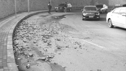 昨日15时许,在南山隧道东出口桥下的弯道上,一辆小货车转弯时将车上的10多箱啤酒“甩”出。