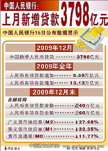 中国人民银行上月新增贷款3798亿元