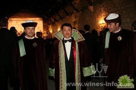 在宏大阴凉的伊桑酒庄地下酒窖里要为今年的40名对波尔多葡萄酒文化推广做出特殊贡献的行业人士授勋。台上四位评委身披紫红色长袍,手握金色权杖,庄严而又神圣。被选出的人士被一一请上台,其中包括了山东新宝真公司的总经理潘智群先生。克鲁兹先生介绍到“潘智群先生在17年前白手起家创业,专心经营中国白酒,在不懈的努力下将家族企业打造成一个全国知名的实力经销商。几年前,被神奇的法国葡萄酒所打动,开始同露桐家族等知名波尔多酒商合作。作为政协委员的潘先生还积极努力,希望将孔子学院引进波尔多。为两国文化的交流做出了积极的努力和贡献”。 在全场各国嘉宾的热烈掌声中,潘智群先生被披上了传统的大红袍。这表明了波尔多酒庄主们对中国市场的重视和对新宝真公司今天取得成绩的肯定。