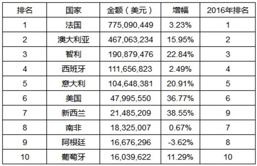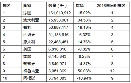 按金额,2017年1-9月瓶装酒出口至中国的前十位(金额)产酒国分别为: