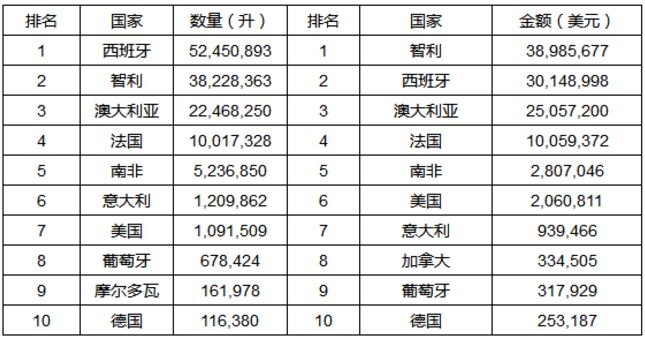 出口散装葡萄酒至中国的产酒国中,1-9月数量与金额前十位的国家分别为: