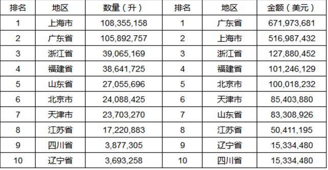 1-9月瓶装葡萄酒进口量与进口额前十位的省市区分别为:
